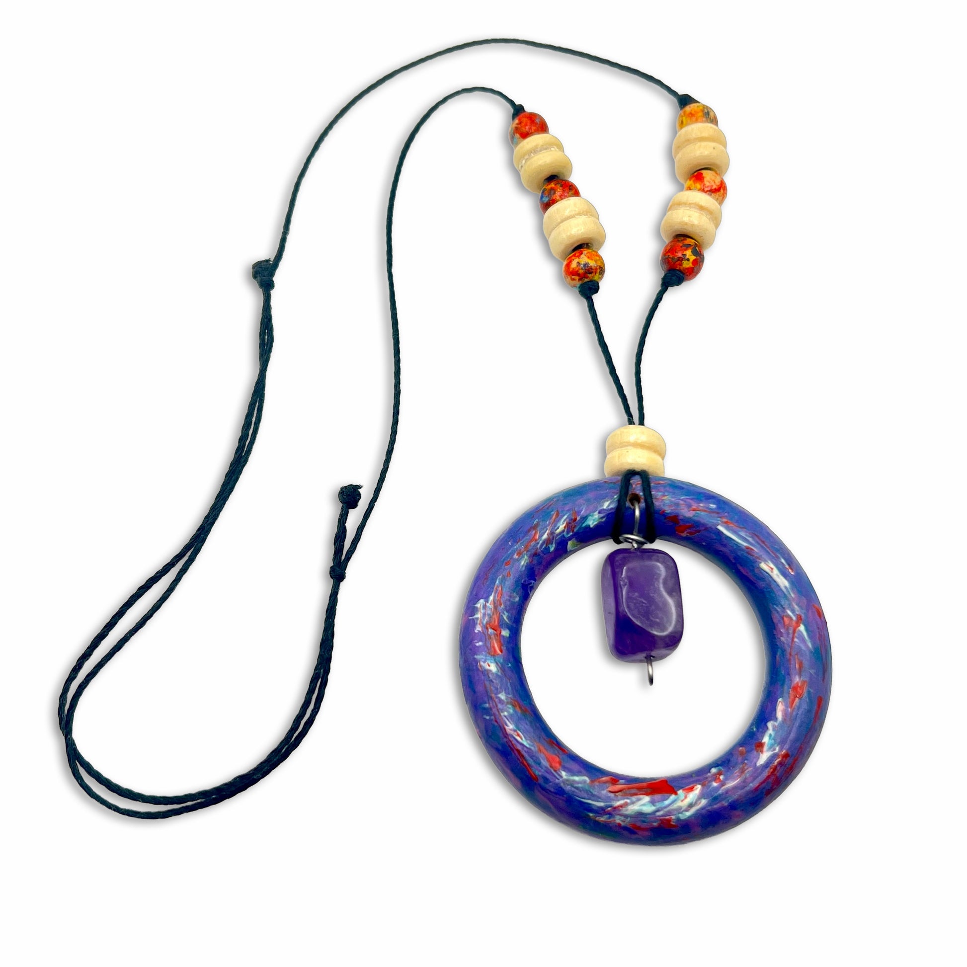 Reiki infused, handmade and adjustable necklace with wooden elements and Amethyst. Great for opening upper chakras, intuition and protection from negativity. Wooden elements are hand-painted. Made of cotton, wood, acrylic and stainless still. wooden pendant is 2 inch wide, cord max length 26 inc, min 16inch.