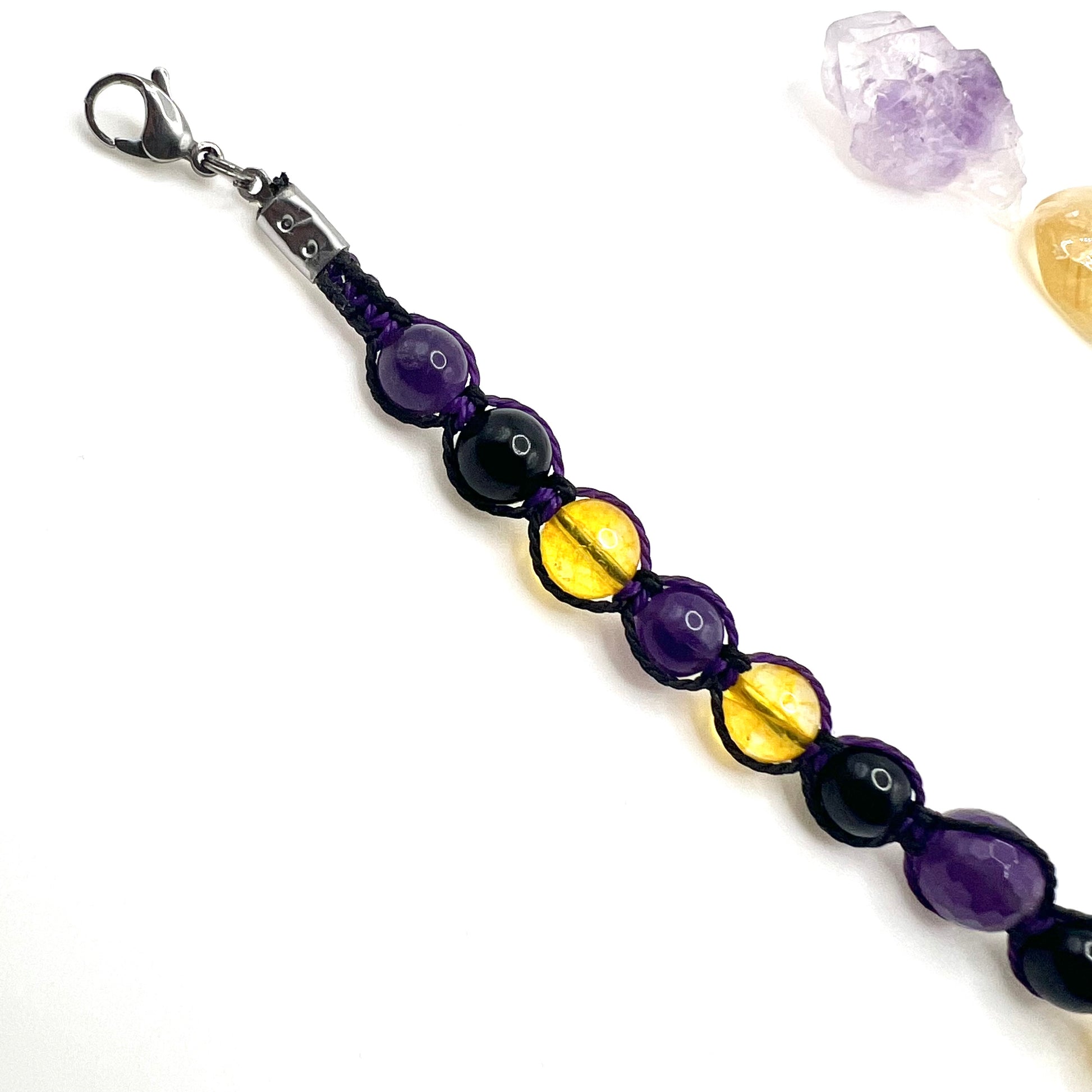Handcrafted, Reiki infused bracelet with wrapped crystals: Amethyst- support intuition and peace of mind, Tourmaline- great for protection from negative energy, and Citrine-brings joy and abundance. Fit best wrist size 6,5 inch. Package include bracelet only.