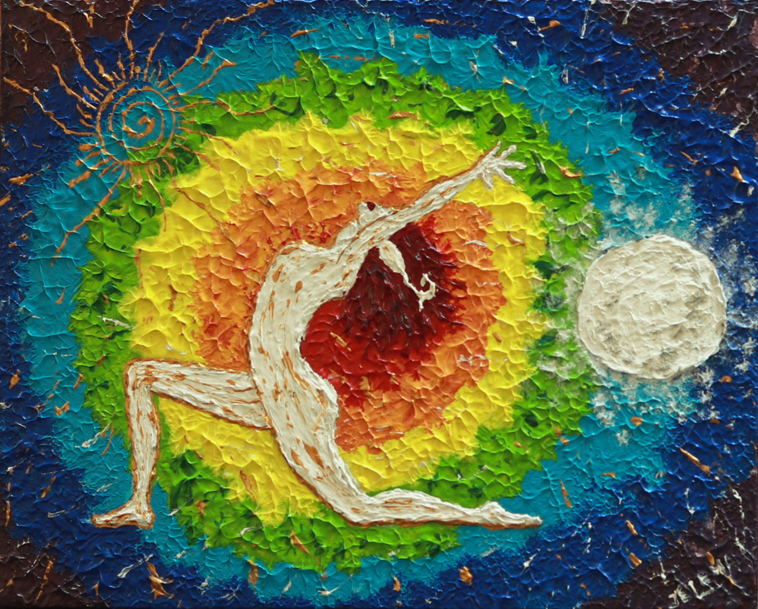 Framed acrylic painting on canvas board 11x14 inch, inspired by Yoga- "Recharge" a radiant elf woman rises in crescent moon pose, her red hair spiralling into a full Chakra rainbow- a living mandala of healing energy. Through golden veins flowing through her body she channels divine power from the golden spiral Sun and her white body attract energy of the Full Moon, creating perfect balance in her being as well balance of action and stillness. Art with heart- 10% of sale will be donated to support children in need of medical care.
